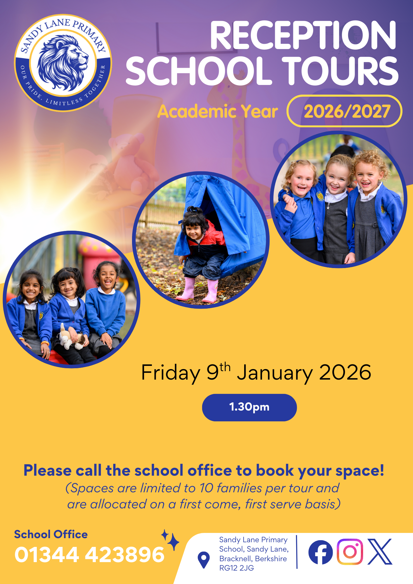 We are pleased to announce that we are welcoming families to Sandy Lane Primary on Friday 9th January at 1.30pm, who are interested in joining us in September 2026.