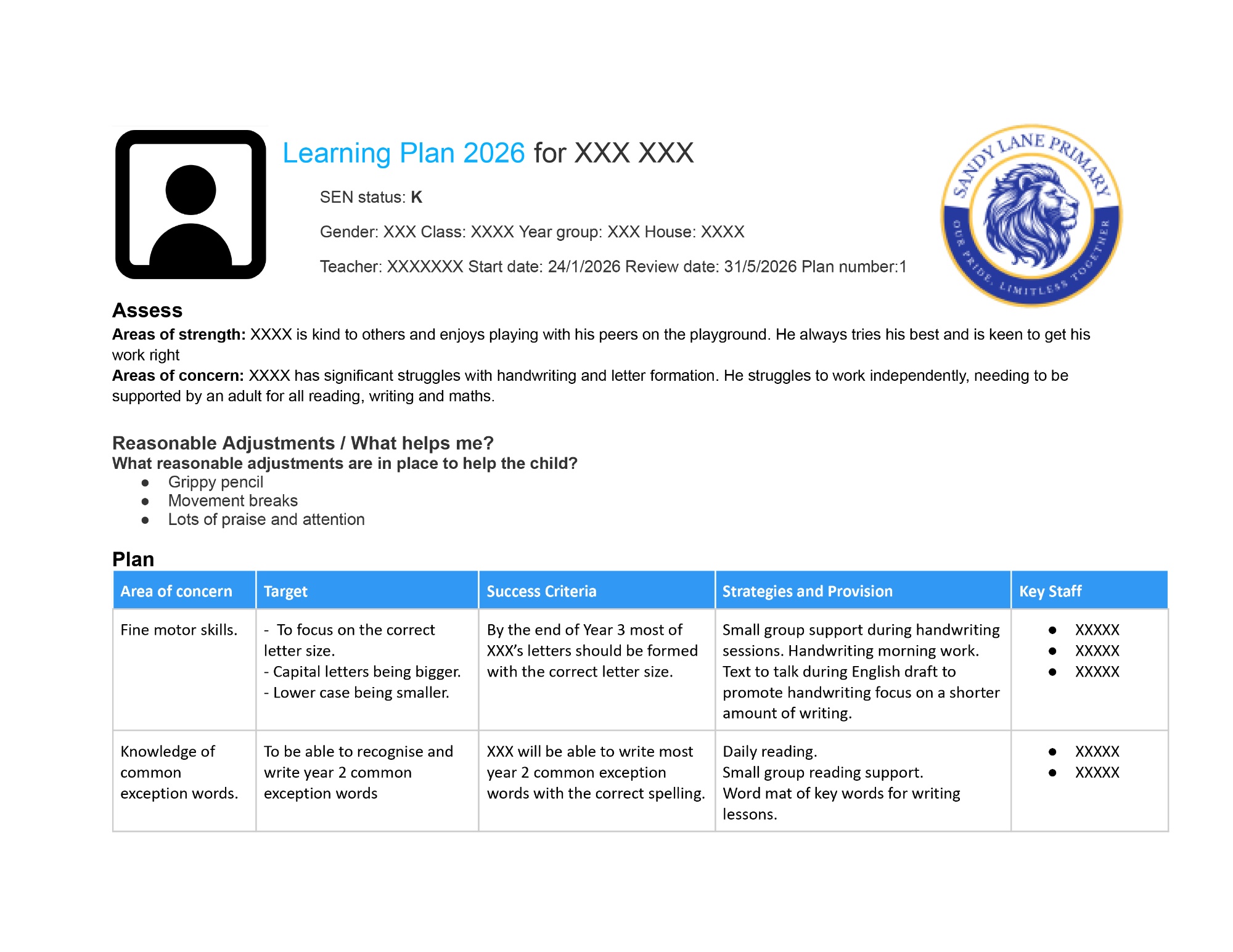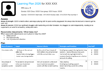 This may include progress in areas other than attainment, for example, social needs. Attendance and behaviour data might also be used to identify which pupils require additional support. A graduated approach to SEND identification is followed at Sandy Lane Primary School so that an assess, plan, do, review process is used to identify strengths and barriers and plan for support.
